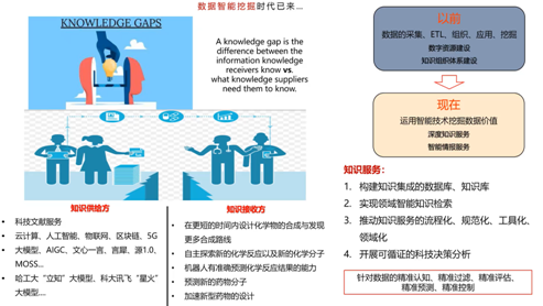 刘春江博士首先介绍了数据智能挖掘时代背景下,云计算、人工智能、区块链、大模型等新技术的快速发展与应用使得情报服务机构的工作内容已从以前的数据资源和知识组织体系建设转变为运用智能技术挖掘数据价值,提供深度知识服务和智能情报服务。基于此背景,使用科技资源尤其是专利、论文等典型科技资源进行智能挖掘,可以更好地揭示专利中蕴含的技术问题、技术方案、技术功能、技术效果、技术领域等信息,可以更系统地介绍论文中蕴含的科学问题、实验元素、实验方法、实验结果、实验目标、实验材料、实验步骤、实验仪器等信息。该方面已被应用的系统有COSMOS、基于文献的癌症知识发现(LBD)系统等。